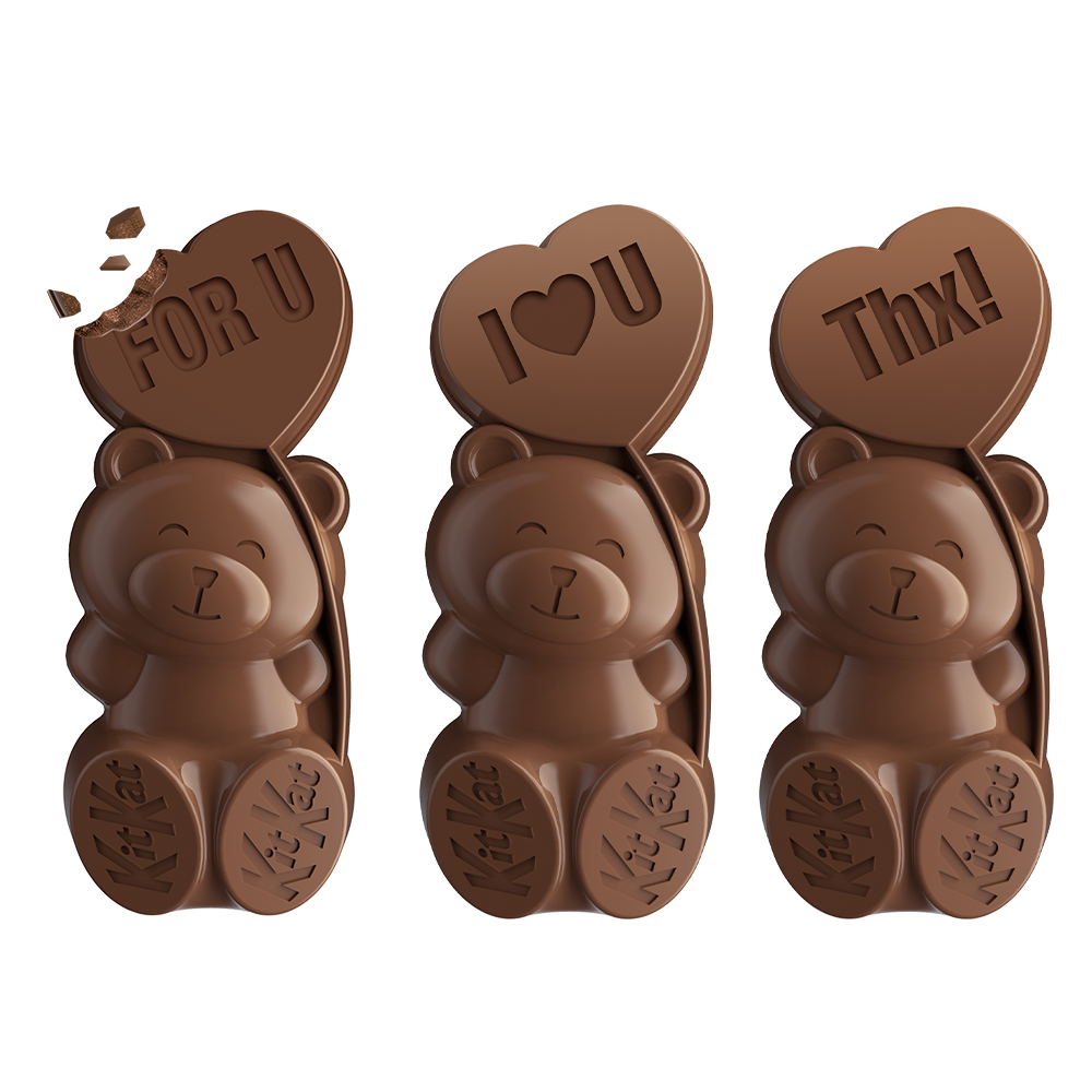 ▼首先登場的是「KitKat LOVE小熊威化」,以其超萌的小熊造型立刻擄獲眾人的少女心。不僅如此,小熊手上的心型氣球更隱藏著甜蜜的訊息,如「FOR U」、「I ♡ U」和「THX!」,給你大膽表白的機會。更特別的是,其包裝設計還附有留言板,讓你在送禮時能夠直接表達心中的愛意。