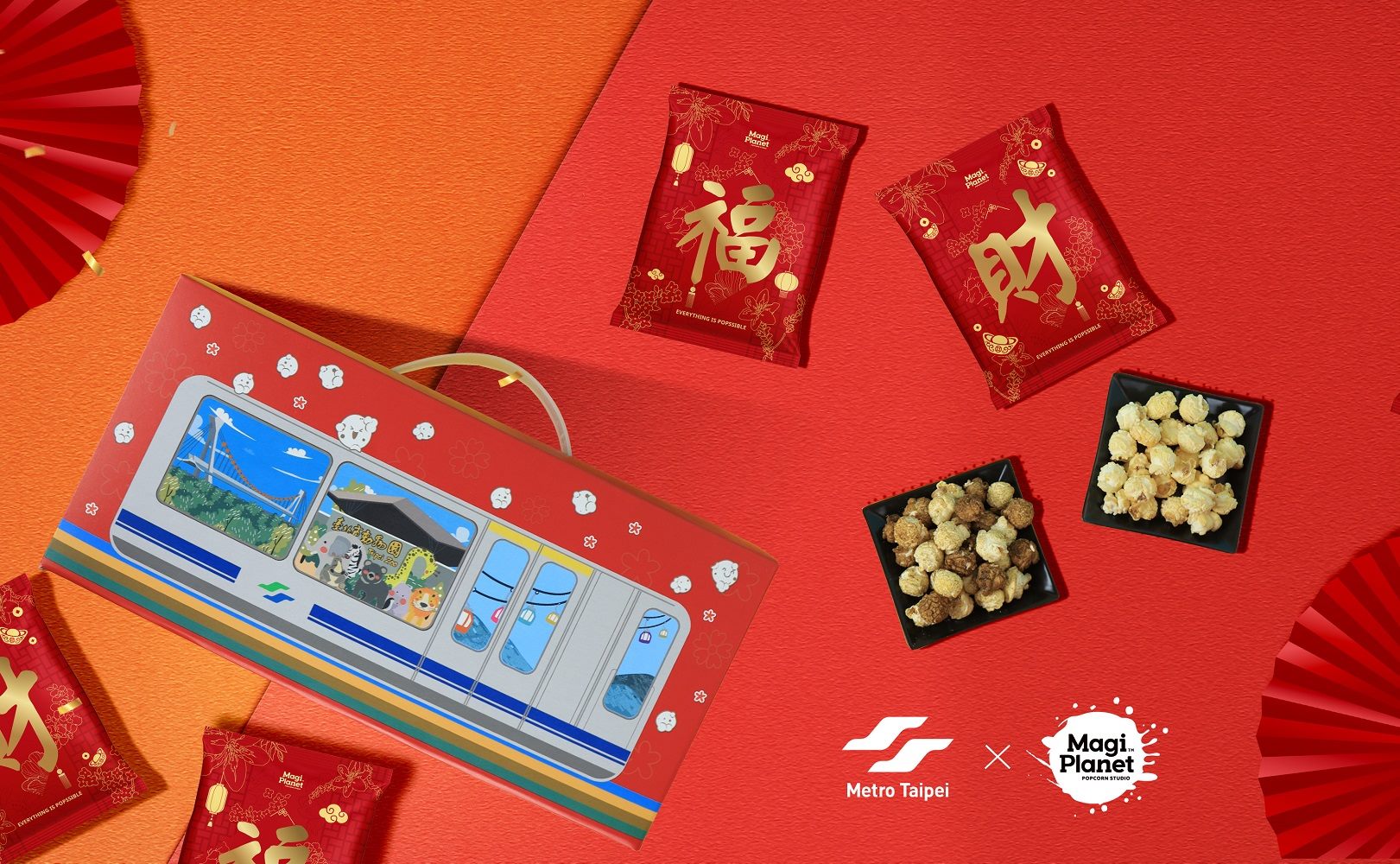 ▼除此之外,臺北捷運首次與星球工坊合作,推出了豐富多彩的「爆米花年節禮盒」。禮盒中包含黑松露及紅玉拿鐵口味爆米花共8包,每包都用紅包袋造型包裝,印有「財」、「福」燙金字樣,添增節日氣氛。值得一提的是,每售出一盒都會捐贈10元給慈善單位,買福氣的同時也傳遞愛心哦~