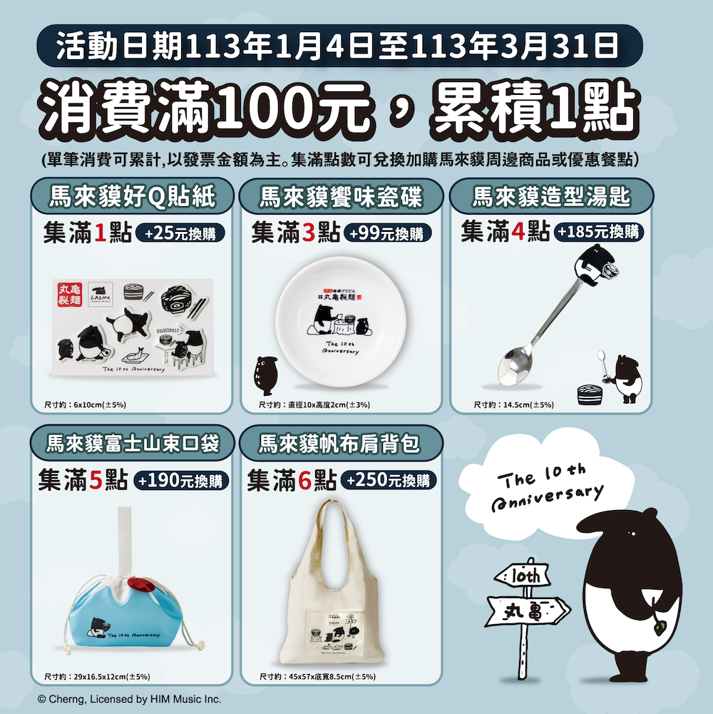 2024年02月15日開工又要迎接補班日,各位的心情還好嗎~不必心酸!日本人氣品牌丸亀製麵為了慶祝10周年,特別推出超值限定優惠!只需參與活動,就能以「10元」換購丸龜製麵的中碗湯烏龍麵一碗!此外丸亀製麵還與「LAIMO馬來貘」聯名推出5款超萌的周邊商品,吃麵還有可愛商品可以收,真的太療癒了吧!