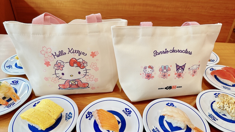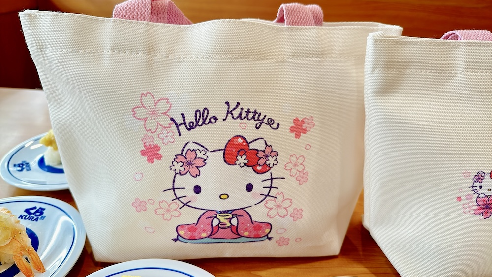 ▼第二波則可兌換美美的「Hello Kitty 手提袋」,正面印上大型和服Hello Kitty,來跟各位喜迎新年,背面則有四位三麗鷗小夥伴坐鎮。一個包包瞬間聚集好多三麗鷗人氣角色啦!只要在全台藏壽司單筆消費滿1,200元,並參與品牌社群活動就能當場獲得這些可愛贈品!
