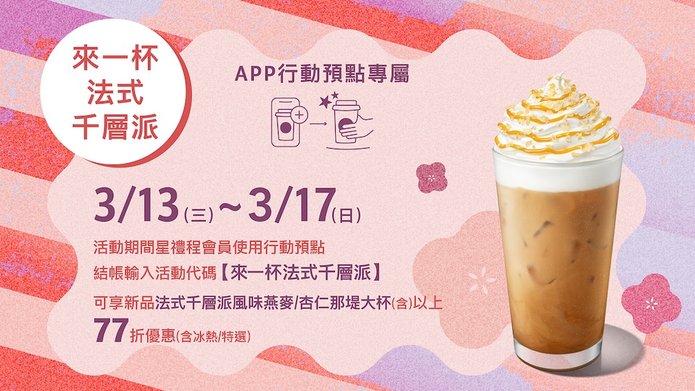 優惠活動:3/13-17期間星禮程會員使用行動預點,結帳輸入活動程式碼「來一杯法式千層派」,可享新品法式千層派風味燕麥/杏仁那堤大杯(含)以上77折優惠(含冰熱/特選)。