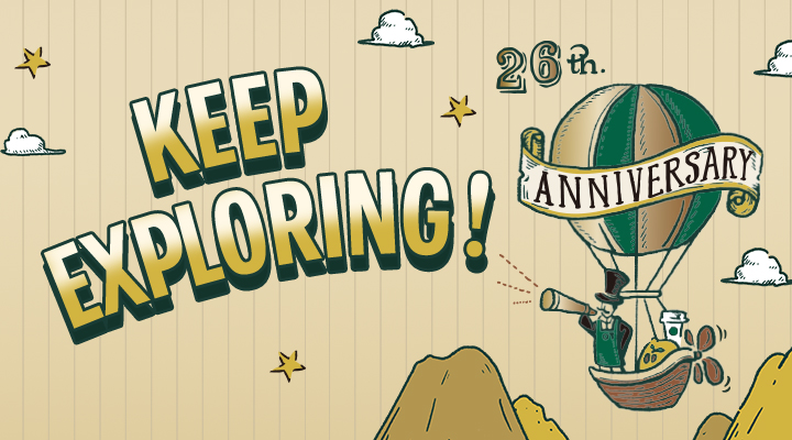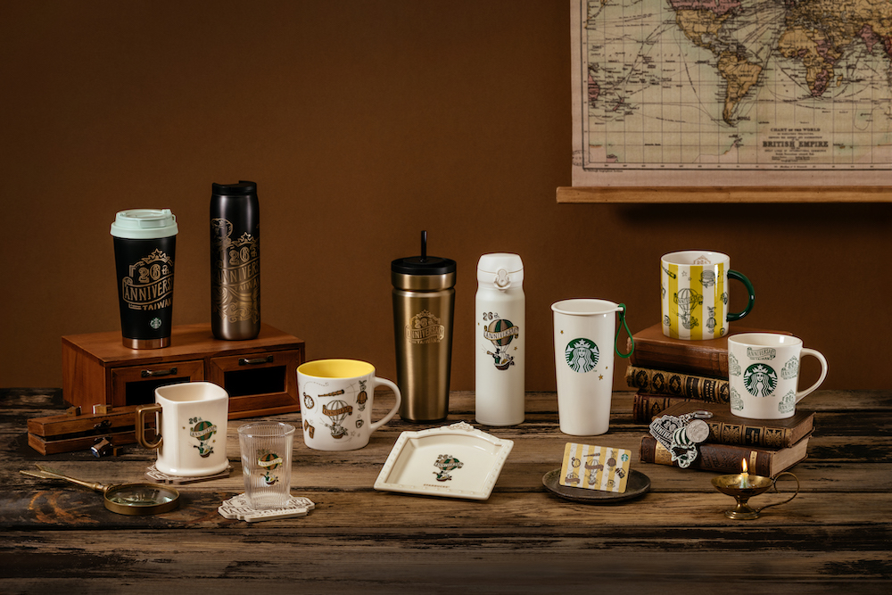 ▼除了新飲品,星巴克也推出了26週年紀念系列商品,設計主題為復古探險,並採用版畫線條風格,將20多款包括不鏽鋼杯、馬克杯、杯墊及鑰匙圈等商品注入了歡樂與活力的元素!