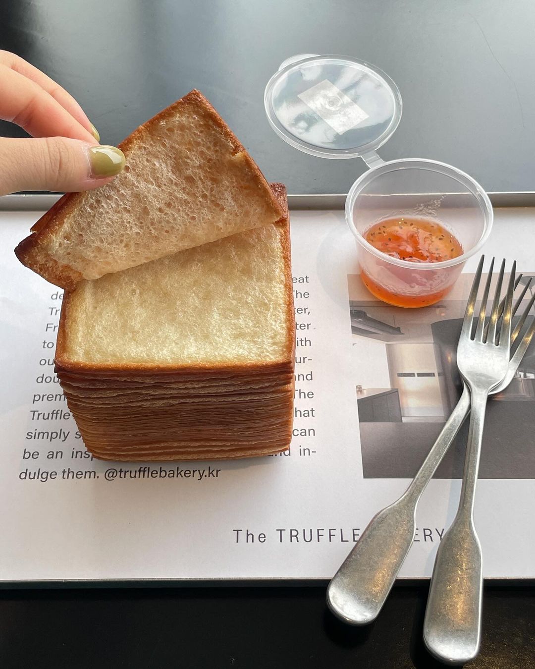▼漢南洞的松露咖啡廳雖然開業不久,但憑藉這款「紙巾吐司」已成功吸引眾多目光,成為網上熱議的焦點。除了這款創新吐司,咖啡廳還提供各式各樣的美食,大家可以到現場品嚐看看喔~