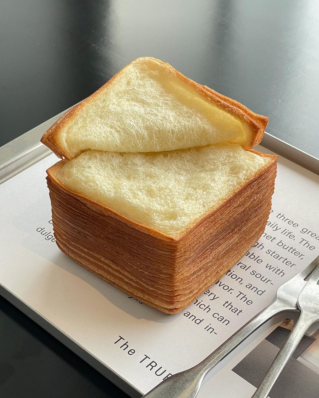 ▼「紙巾吐司」之所以特別,不在於它的外觀,而是它獨特的質感和食用方式。使用特別混合配方麵粉和高含量的法國頂級奶油,這款吐司呈現出了令人難以置信的濕潤、彈性以及香濃的奶油味。最有趣的部分是,你可以像撕紙巾一樣,一層層地撕開它享用!