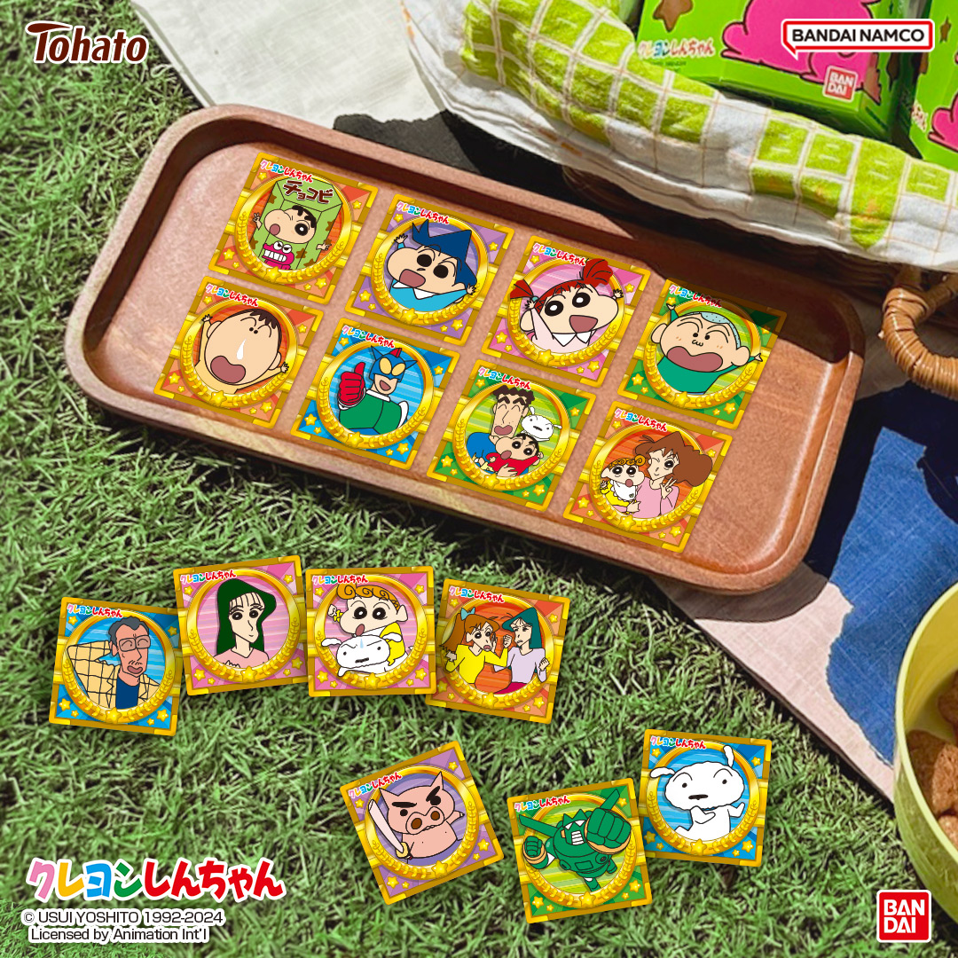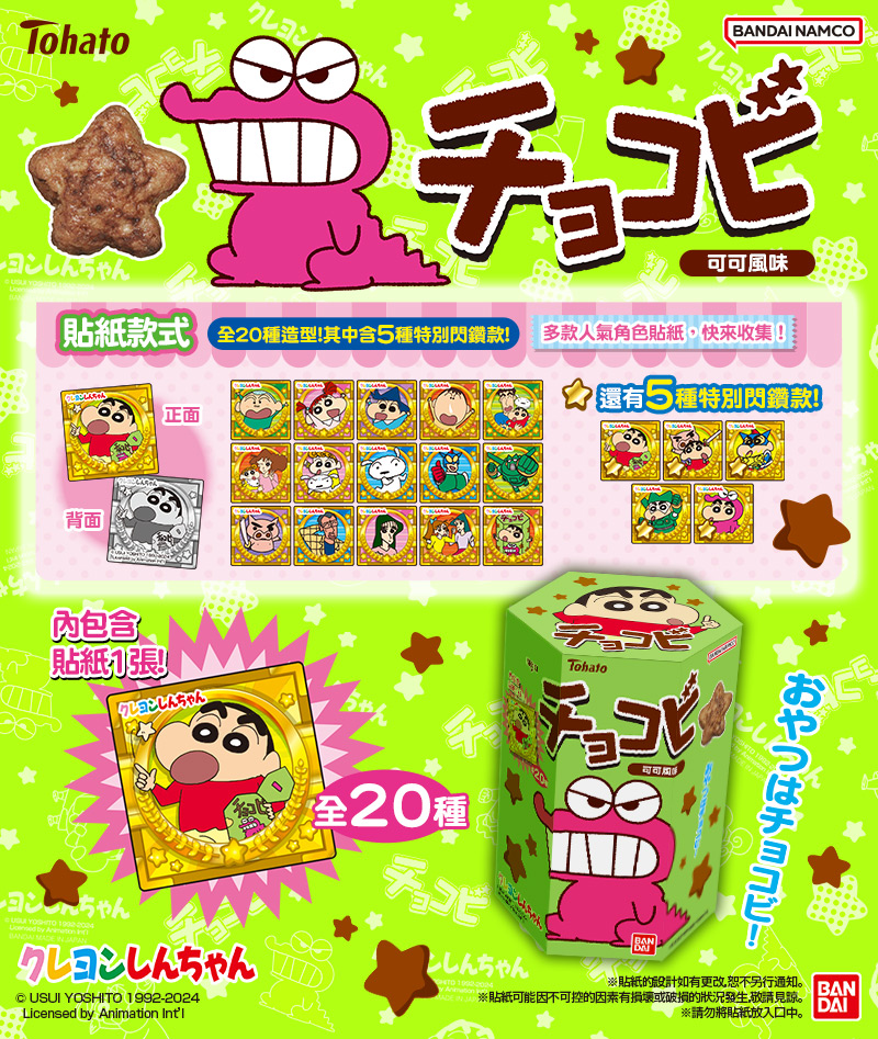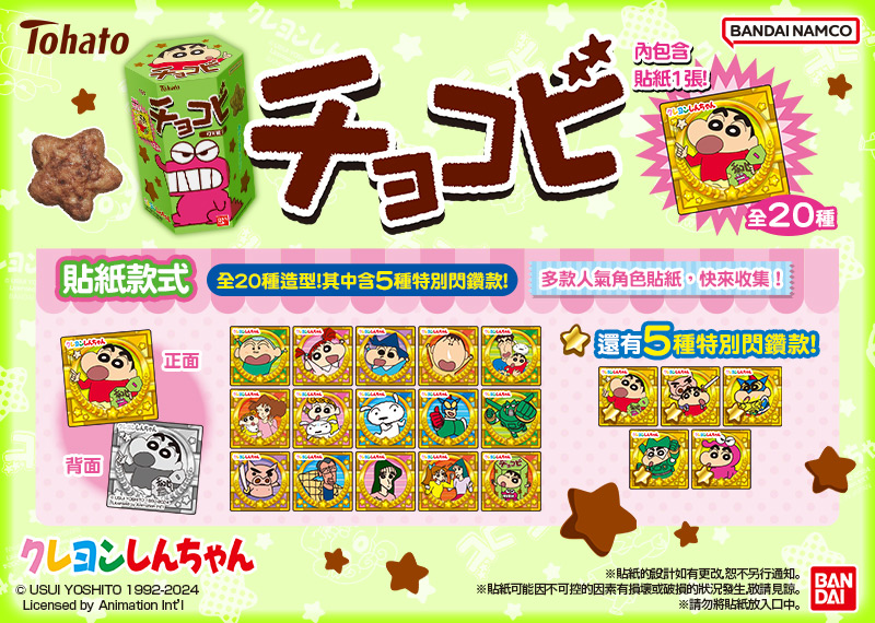 ▼每一盒巧克比可可風味餅乾還會隨機贈送一款《蠟筆小新》角色貼紙,包含春日部防衛隊、雙葉幼稚園師長和野原一家人,還有動感超人、康達姆機器人、肥嘟嘟左衛門等小新最愛的人氣角色,每一款都是經典必收!