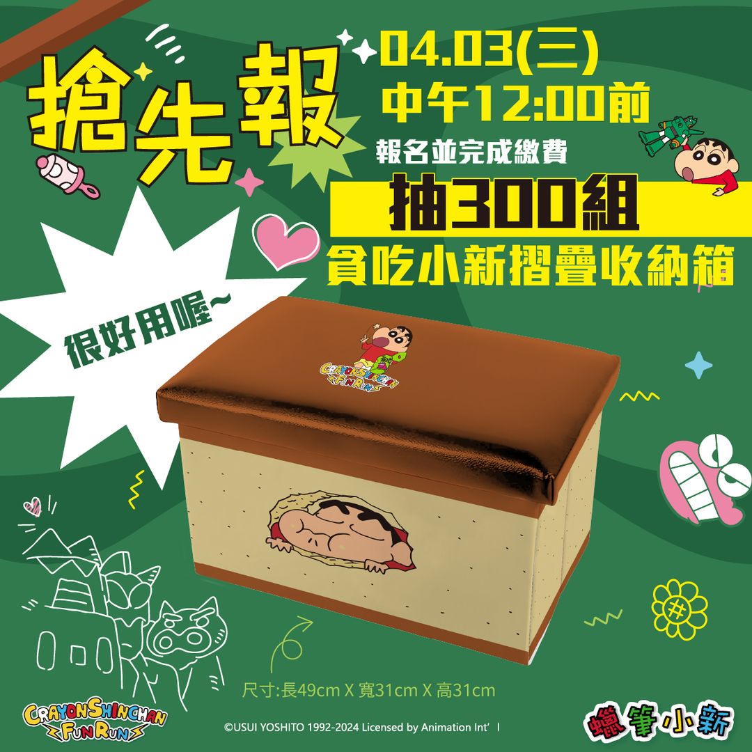 ▼更令人興奮的是,早鳥報名還有機會獲得300組「貪吃小新摺疊收納箱」!這些收納箱不僅實用,而且還能作為小凳子,其上的小新蜂蜜蛋糕圖案也是超級可愛。