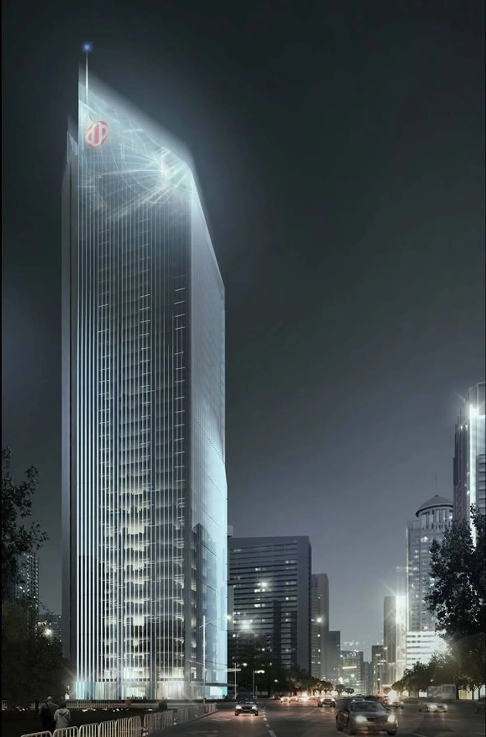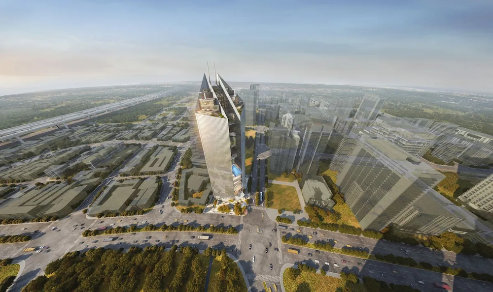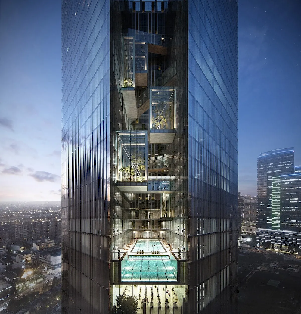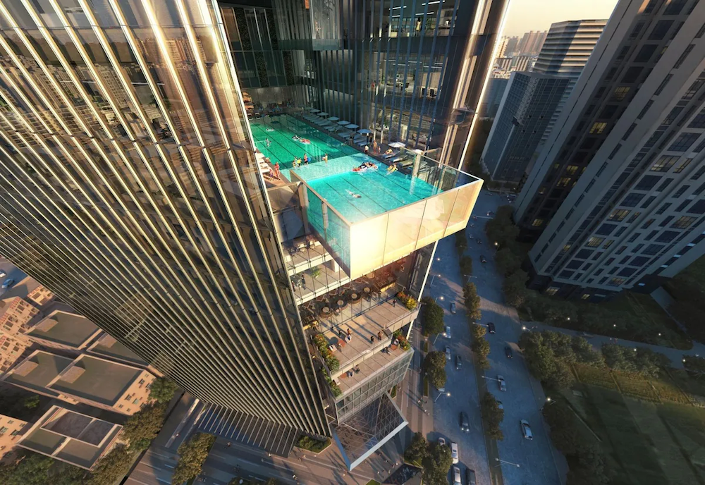 ▼建築的中央凹陷部分被賦予了聚寶盆的象徵意義,大門朝向交叉口的對角線,使建築呈現45度角的獨特姿態。頂部斜尖塔和建築的雙三角形剖面,讓整體設計語言既連貫又新穎。最吸睛的莫過於那個透明懸空泳池了,泳池不僅透明,還懸空!在這裡游泳,就像在空中划水一樣,既刺激又好玩。