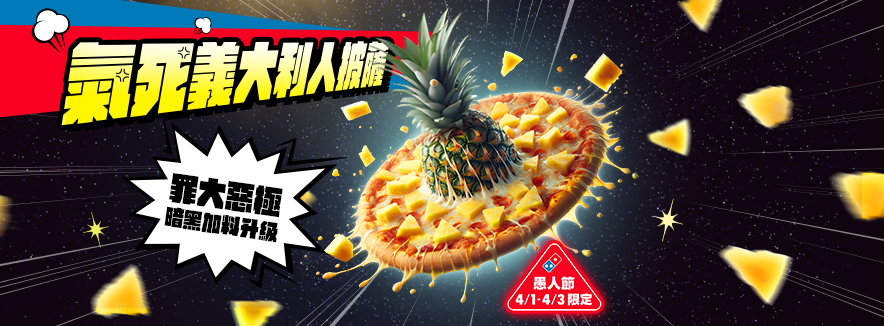 2024年03月31日今年愚人節達美樂決定加入「氣死義大利人」的行列,與必勝客的「芝心蛇圈圈」打對台,推出一款超有創意的新品-「半顆金鑽鳳梨披薩」!你沒看錯,這不是普通的鳳梨披薩,而是將超大量的鳳梨直接鋪在披薩上,如此大膽的設計馬上衝擊網友!