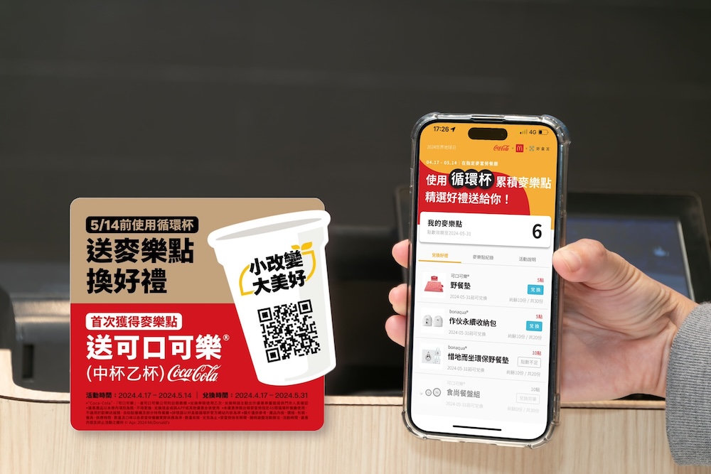 ▼除了「舉杯之勞做環保」活動之外,麥當勞還聯合可口可樂公司推出了「來麥當勞借循環杯 可口可樂®再一杯」活動。從4月17日到5月14日,顧客只要在循環杯租借服務的麥當勞餐廳借杯購買飲料,並在期限內歸還循環杯,就能免費獲得中杯可樂®兌換券一張。此外,今年更加碼集點活動,顧客可以獲得麥樂點數,並有機會獲得限量野餐墊、收納包或餐盤組等多款獨家好禮!
