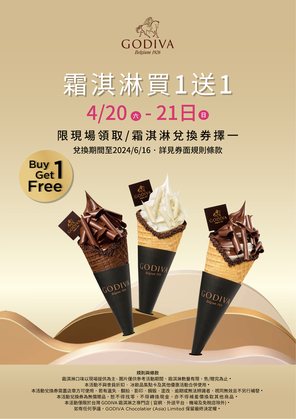 ▼這次的「買一送一」活動僅限這個週末(4月20日至21日)兩天,如果你擔心當天無法與朋友相聚,GODIVA也貼心提供了兌換券選項,讓你可以稍後再享用這份甜蜜。想想看,這個週末與三五好友一起,坐在GODIVA的店裡或帶著霜淇淋漫步在溫暖的春日陽光下,那畫面多美!