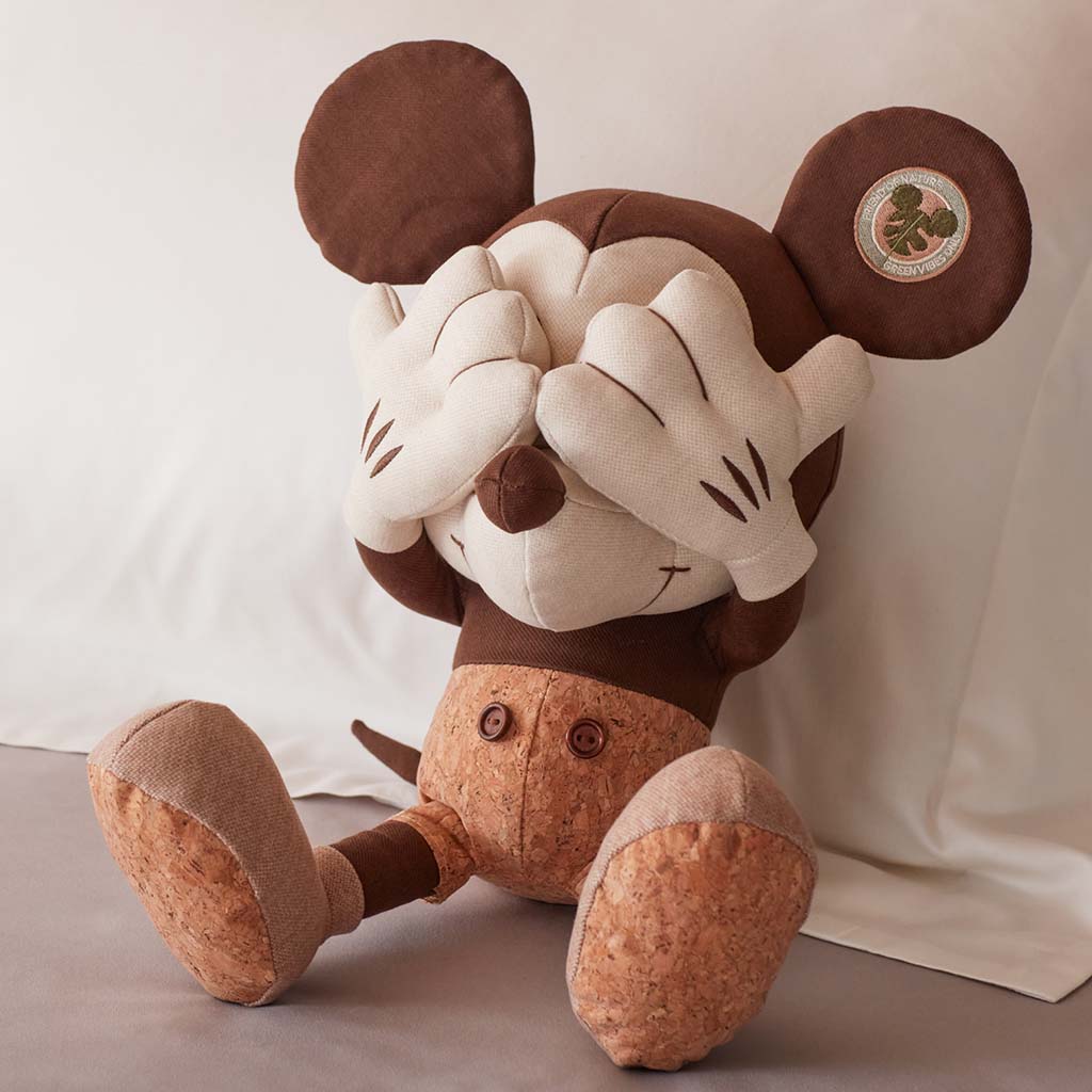 ▼「永續米奇玩偶」的枕芯填充物是使用通過GRS 4.0認證的聚酯纖維,環保回收紗是利用粉碎的廢棄塑膠中拉出的絲線,完整體現愛護地球(直接身體力行!)。