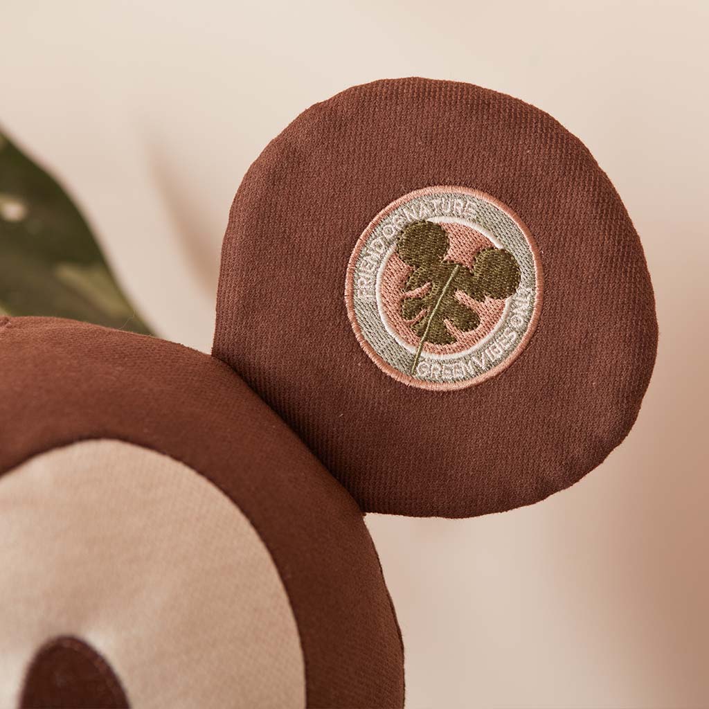 ▼米奇右耳還能看到限定的「米奇造型徽章」,仔細看可以發現是龜背芋造型!其象徵意義為健康與療癒,提醒大家要時刻落實環保、愛護地球媽媽,讓後代都能擁有一個無「塑」未來。