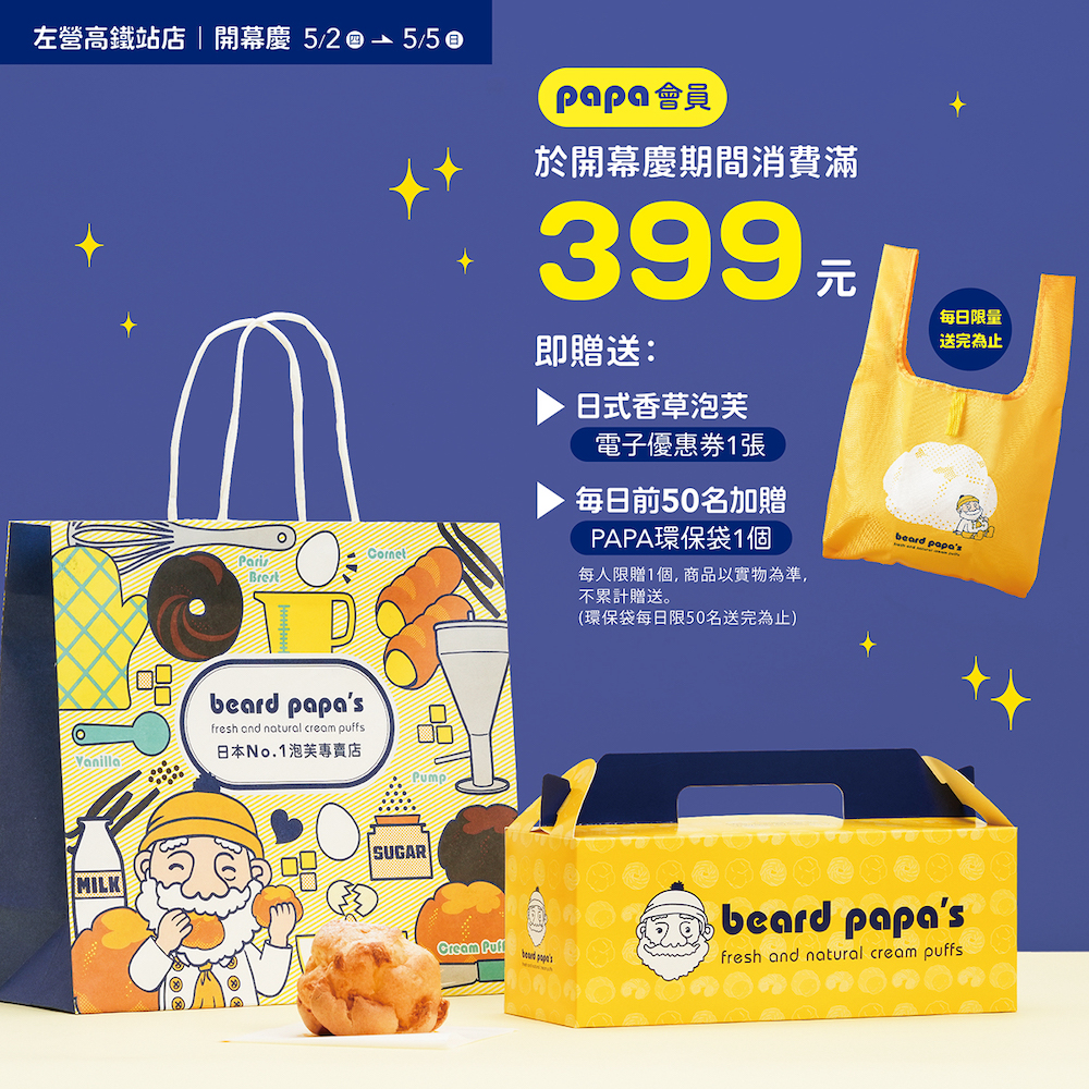 ▼另外,5月2日beard papa’s在高雄左營高鐵站盛大開幕第三家門市。開幕期間,只要在該門市消費達到指定金額,就能獲得日式香草泡芙電子優惠券一張,而每日前50名顧客還能額外獲得一個beard papa's摺疊環保袋!