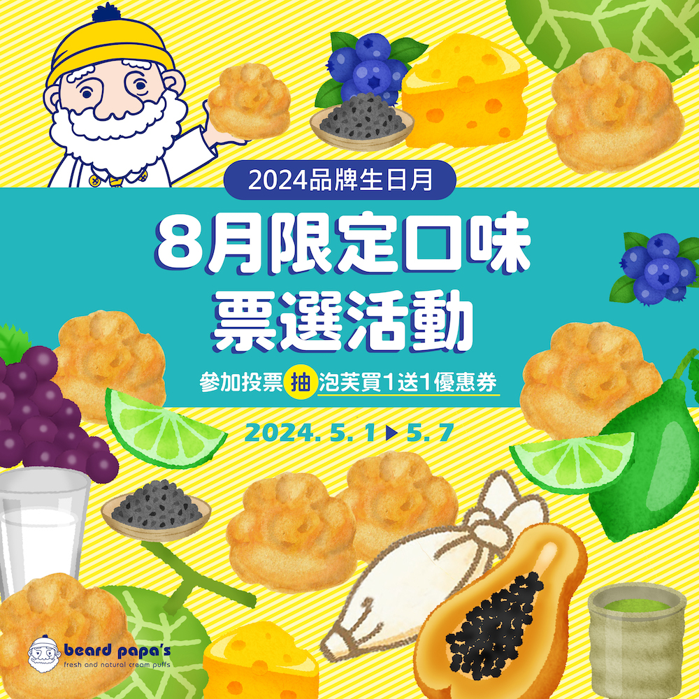 ▼8月份的限定口味也讓人很期待!beard papa’s每年的生日月,都會舉辦慶生活動,今年8月,他們將推出由粉絲投票選出的限定口味泡芙。從5月1日起,你可以在官網及SNS上參與投票,不僅能參與決定新口味,還有機會贏得電子優惠券。