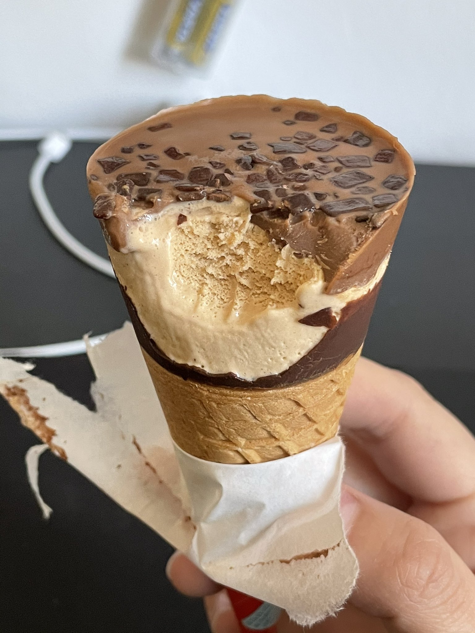 ▼再來說說經典可可甜筒!它的口感超豐富,一口咬下去,能吃到濃厚的榛果醬料和脆脆的果仁碎粒。巧克力冰淇淋的甜度恰到好處,不會讓人覺得膩味。而且,在甜筒的中間,還有一塊長條巧克力棒,為整體口感增添了一抹驚喜。底層尖端的爆漿榛果醬料更是讓人眼前一亮,每一口都是滿滿的幸福感。