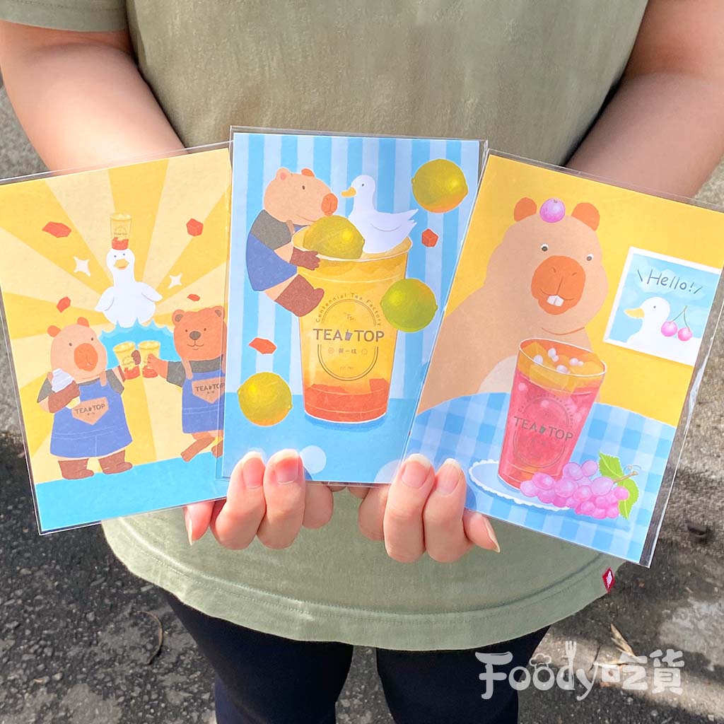 ▼有夠勾錐啦~TEA TOP和台灣插畫家查高合作,超萌的水豚君明信片一定要get!只要有購買新品「紅粿青梅青」或單筆消費滿百,就能把可愛的明信片帶回家!一共三款,大家快來搜集吧♡