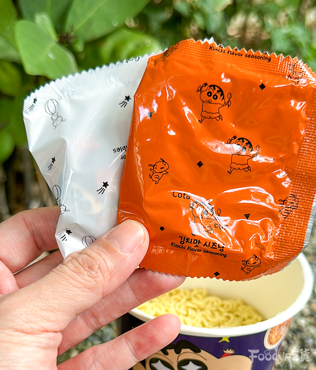 ▼蠟筆小新魚板杯麵內附小叉子、粉包和魚板包,連包裝都做成小新的圖樣,非常得用心。共有牛肉和泡菜兩款口味,兩款的顏色也完全不一樣,小新大快朵頤跟眼神發光都蓋古錐!