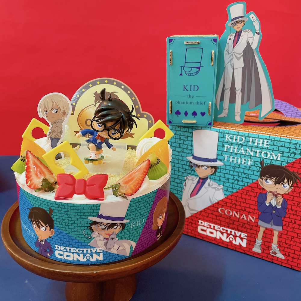▼「名偵探柯南-解謎之旅」則有變聲道具蝴蝶結和造型鎖片巧克力,搭配滿滿的水果和香軟的桔香戚風蛋糕,草莓香緹與綜合莓果醬的夾心,讓甜蜜滋味層層疊加。蛋糕上的柯南公仔踩著滑板,公仔設有穿孔洞設計,可以串成吊飾,內墊高板還能變成怪盜基德造型的存錢筒,實用又可愛。