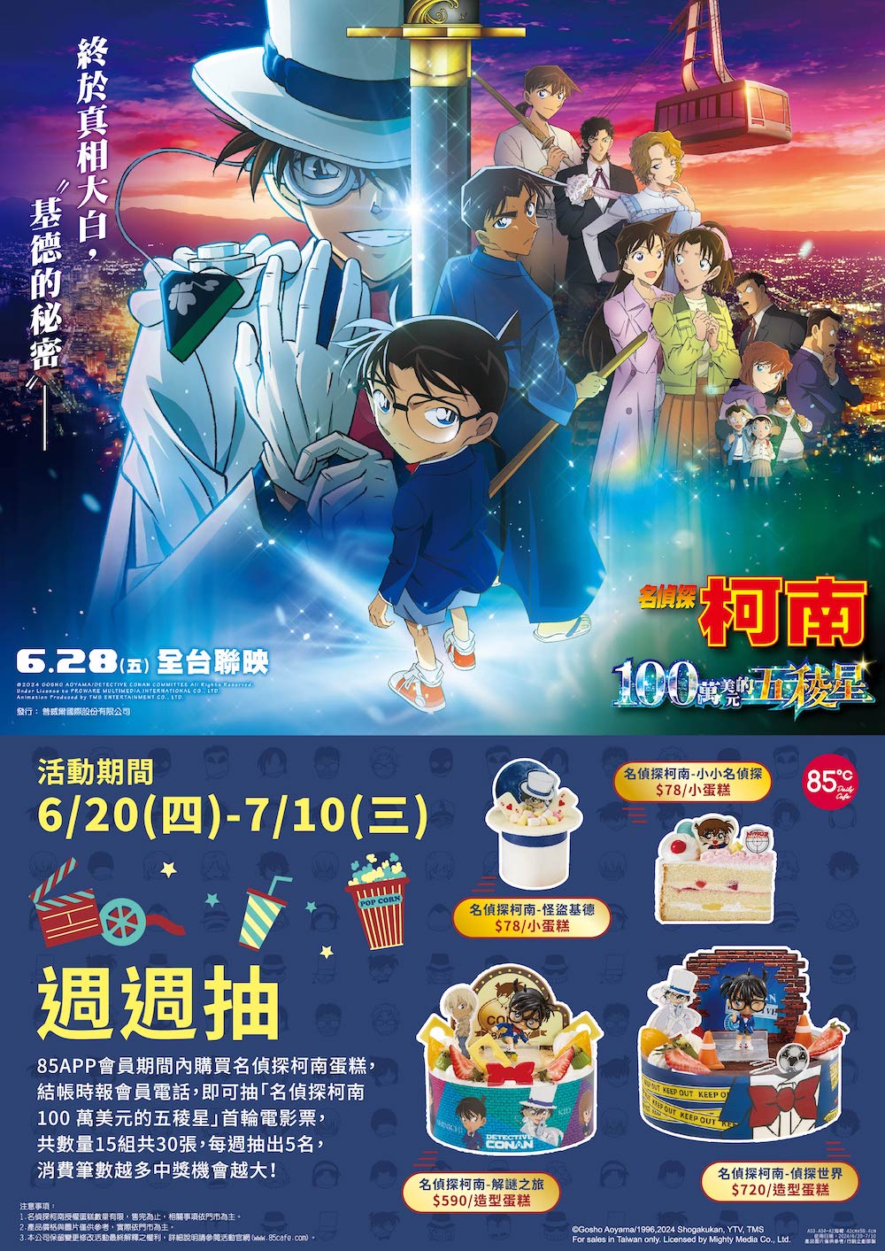 活動:85 APP會員在7/10日前購買任何一款柯南蛋糕,結帳時報會員電話,就能自動抽「名偵探柯南 100萬美元的五稜星」首輪電影票,抽15名,每名2張,共30張,每週抽出5名。