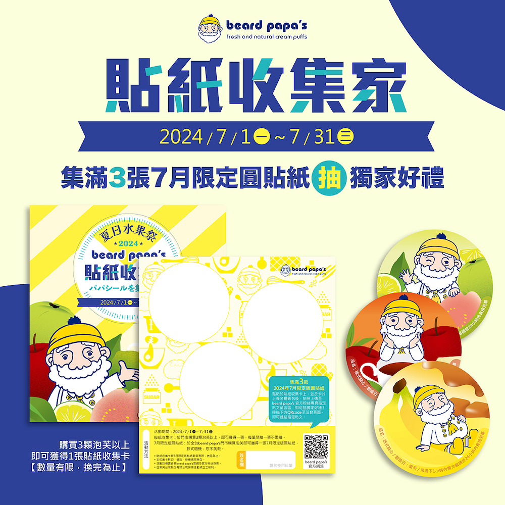 貼紙收集家:活動期間於貼紙收集卡貼上7月限定版三款圓貼紙,並拍照上傳至beard papa’s官方粉絲專頁的指定貼文留言區,就有機會獲得獨家好禮。