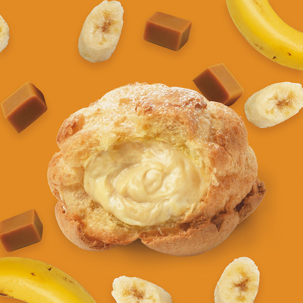 ▼第三種是「香蕉太妃牛奶」,這款泡芙的內餡是用香氣滿溢的香蕉果泥、甜而不膩的太妃糖和牛奶,以絕佳比例拌入beard papa’s經典卡士達製成。一口咬下,香蕉的獨特香氣爆棚,接著迎來太妃糖的甜蜜襲擊,搭配絲滑柔順的卡士達口感,每一口都充滿幸福。快來跟爺爺「蕉」個朋友,一起吃泡芙吧!