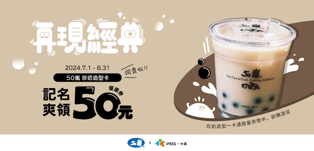 ▼另外,一卡通公司也推出了超值優惠活動。從即日起至2024年8月31日,只要在高雄、屏東及台東的指定門市購買「50嵐珍奶造型一卡通」並完成一卡通記名,就能獲得50嵐的優惠券50元(10元面額×5張)。這些優惠券會在你完成記名後的次月20日前發送到你的iPASS MONEY APP中。下次去50嵐,只要使用iPASS MONEY帳戶付款,單筆消費滿50元,就可以兌換一張,獲得10元的儲值金回饋!