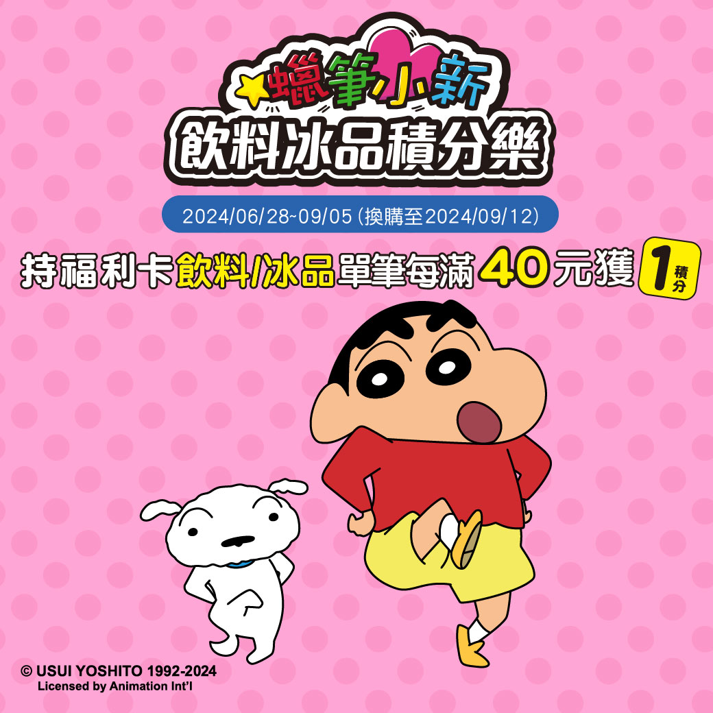 活動機制:持福利卡買飲料/冰品單筆每滿40元獲1蠟筆小新積分,3積分或8積分即可加價換購商品一款。