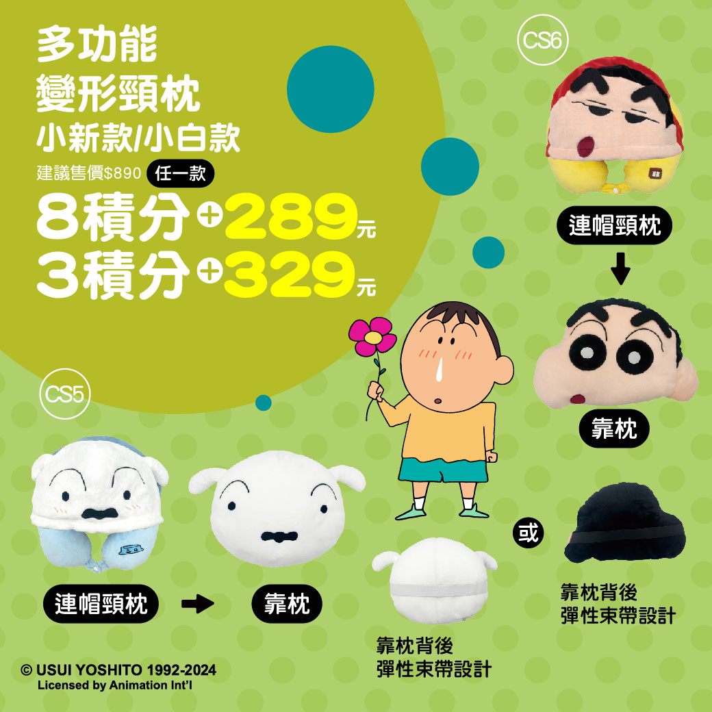 ▼還有多功能變形頸枕,有小新和小白兩款選擇。連帽頸枕可以變形成靠枕,背後還有彈性束帶設計,外出旅行、居家休息都能用到它,好玩又實用。