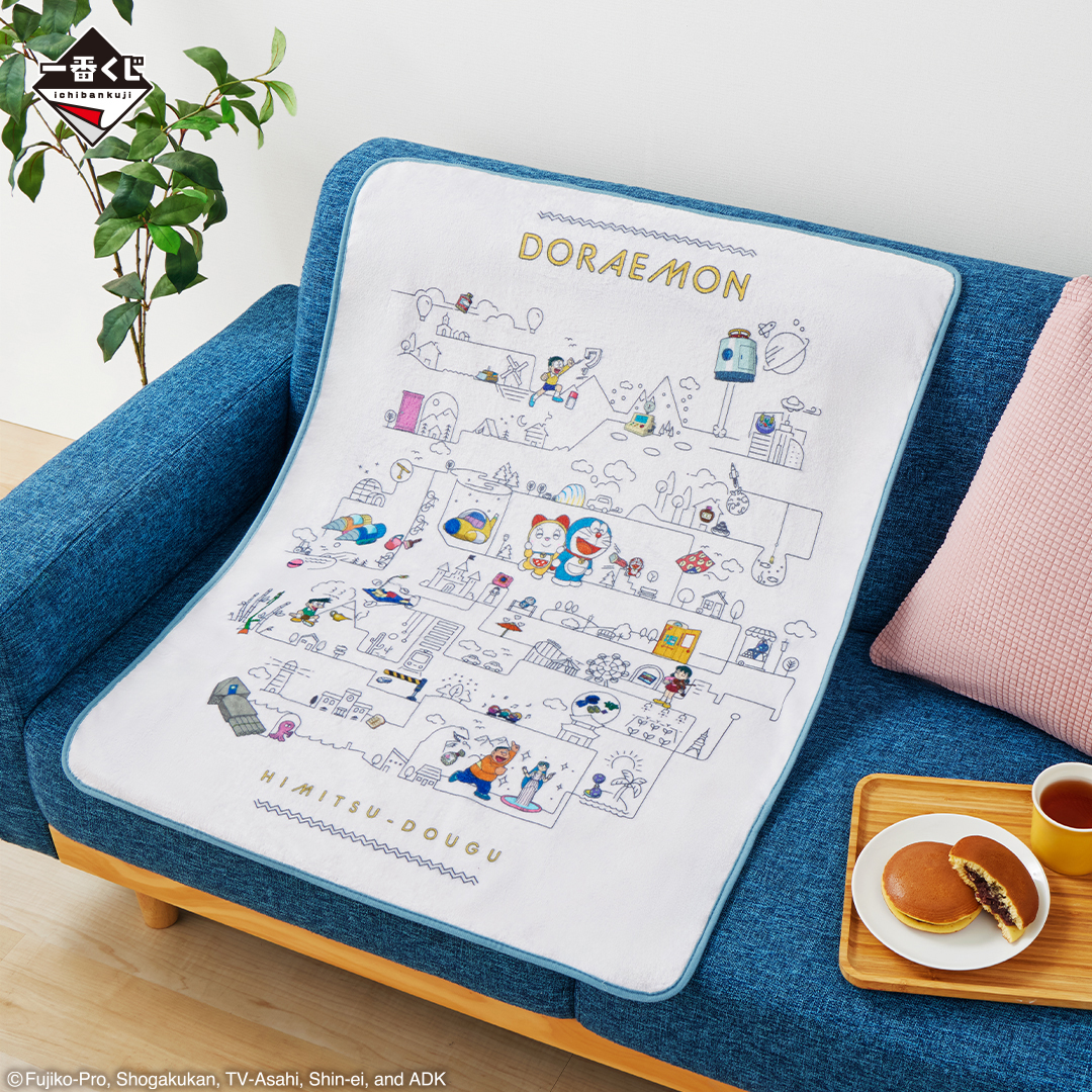▼B獎則是90公分的插畫大毛毯,上面隱藏了時光布、助興樂團、樵夫的泉水等經典道具圖案,既可愛又實用,冬天裡蓋著這條毛毯,看哆啦A夢的動畫,絕對是哆啦粉必收的寶物!