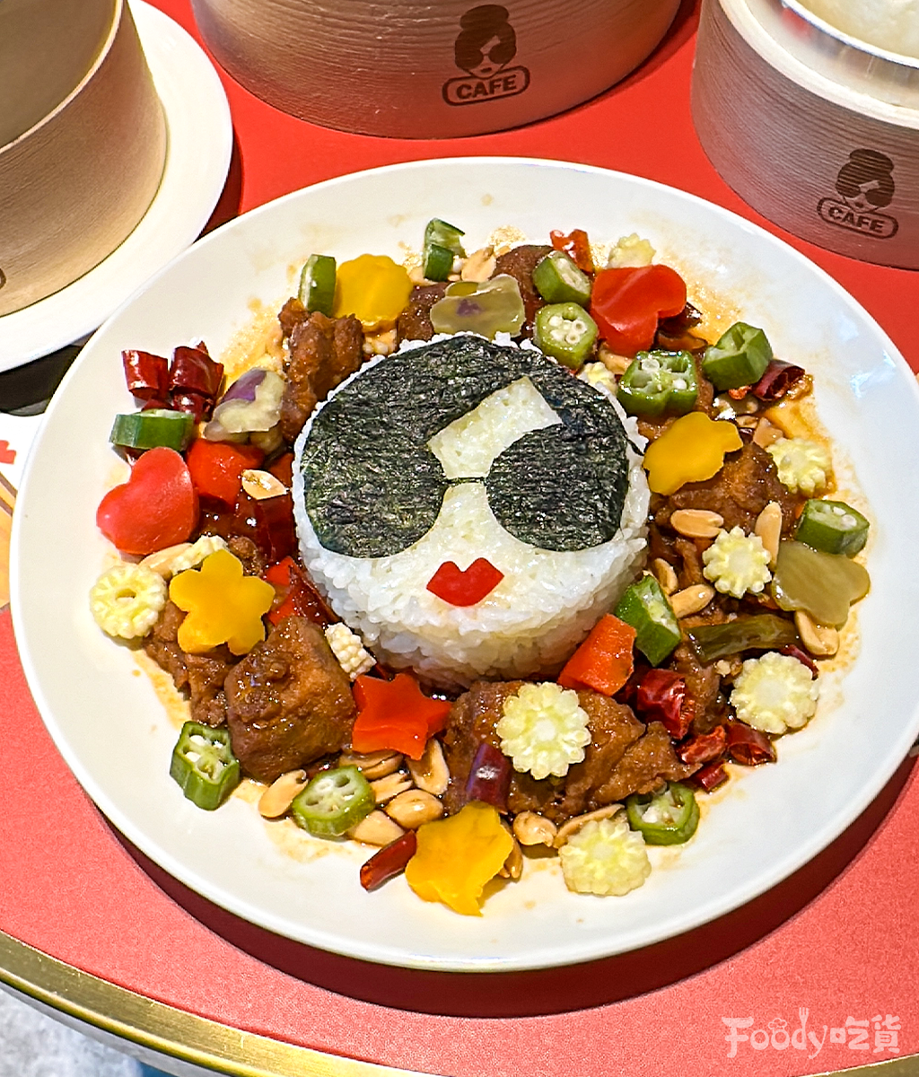 ▼說到中華料理,當然少不了熱炒!alice + olivia café這次也準備了多款熱炒菜色,包括「沙茶牛肉」、「台式三杯雞」和「宮保雞丁」,每一道都美味十足。特別的是,這些熱炒菜色還搭配了純手工裝飾的娃娃頭造型白飯,真是讓人食慾大增。盤子周圍還點綴著星星和花朵造型的五色蔬果,營養又漂亮。