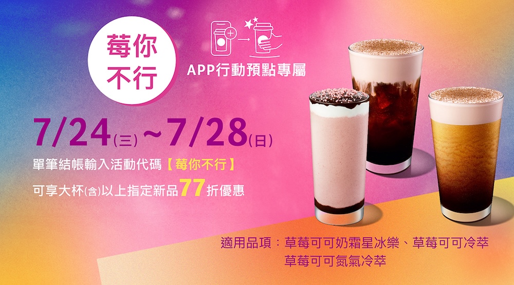 優惠活動:7月24日至7月28日星禮程會員使用活動程式碼【莓你不行】於行動預點服務結帳,大杯以上新品享77折優惠。(品項包括草莓可可奶霜星冰樂、草莓可可冷萃咖啡、草莓可可氮氣冷萃咖啡)