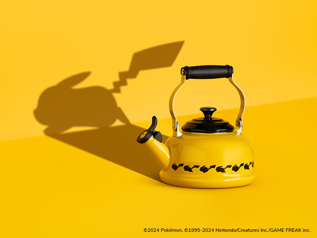 ▼「琺瑯琴音壺」也是無敵可愛!同樣採用了皮卡丘杏桃黃,加上標誌的黃黑配色。外層琺瑯包覆頂級碳鋼,防裂、耐熱且易於清潔。配有單音口哨壺嘴和霓虹色澤的壺蓋,功能性十足。奔跑的皮卡丘剪影環繞壺身,彷彿煮水都能發出皮卡皮卡的聲音呢!