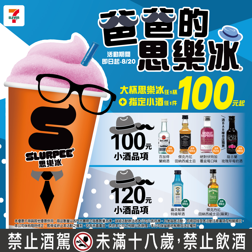 ▼購買須至酒BAR複合店專賣小七,可自行選擇像是百加得蘭姆酒、傑克丹尼田納西威士忌、絕對伏特加覆盆莓口味或龍舌蘭玫瑰草莓奶酒,通通只需100元!另外還可以選擇指定89元的小酒品項,如龐貝藍鑽特級琴酒或傑克丹尼田納西威士忌(蘋果),僅需120元。炎熱的夏天來杯「大人的思樂冰」,讓爸爸在暑氣中感受到沁涼與放鬆!