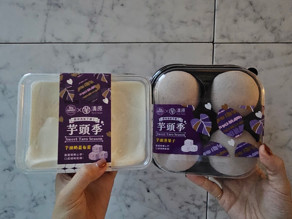 ▼先來看看這次的聯名甜點!首先是「芋頭蒸果子」,細緻柔軟的蛋糕皮裹著滿滿的清原芋頭丁餡料,每一口都能感受到那股濃濃的芋香。接著是「芋見重乳酪」,這款甜點底層是酥脆的塔皮,中間夾著蜜融芋頭丁的重乳酪,再抹上一層厚厚的芋頭鮮奶油,口感層次豐富,真的是愛芋頭者的夢幻逸品!