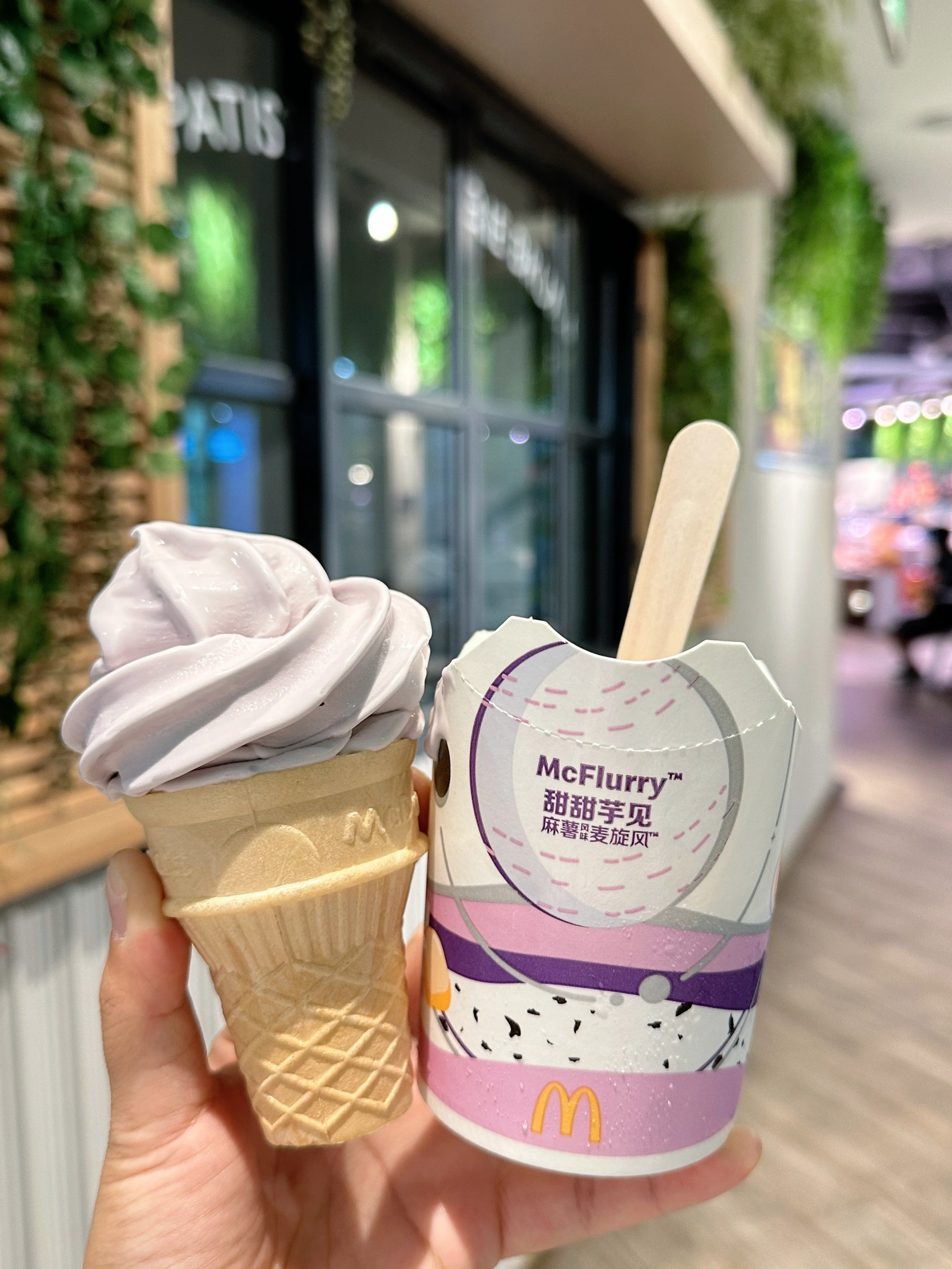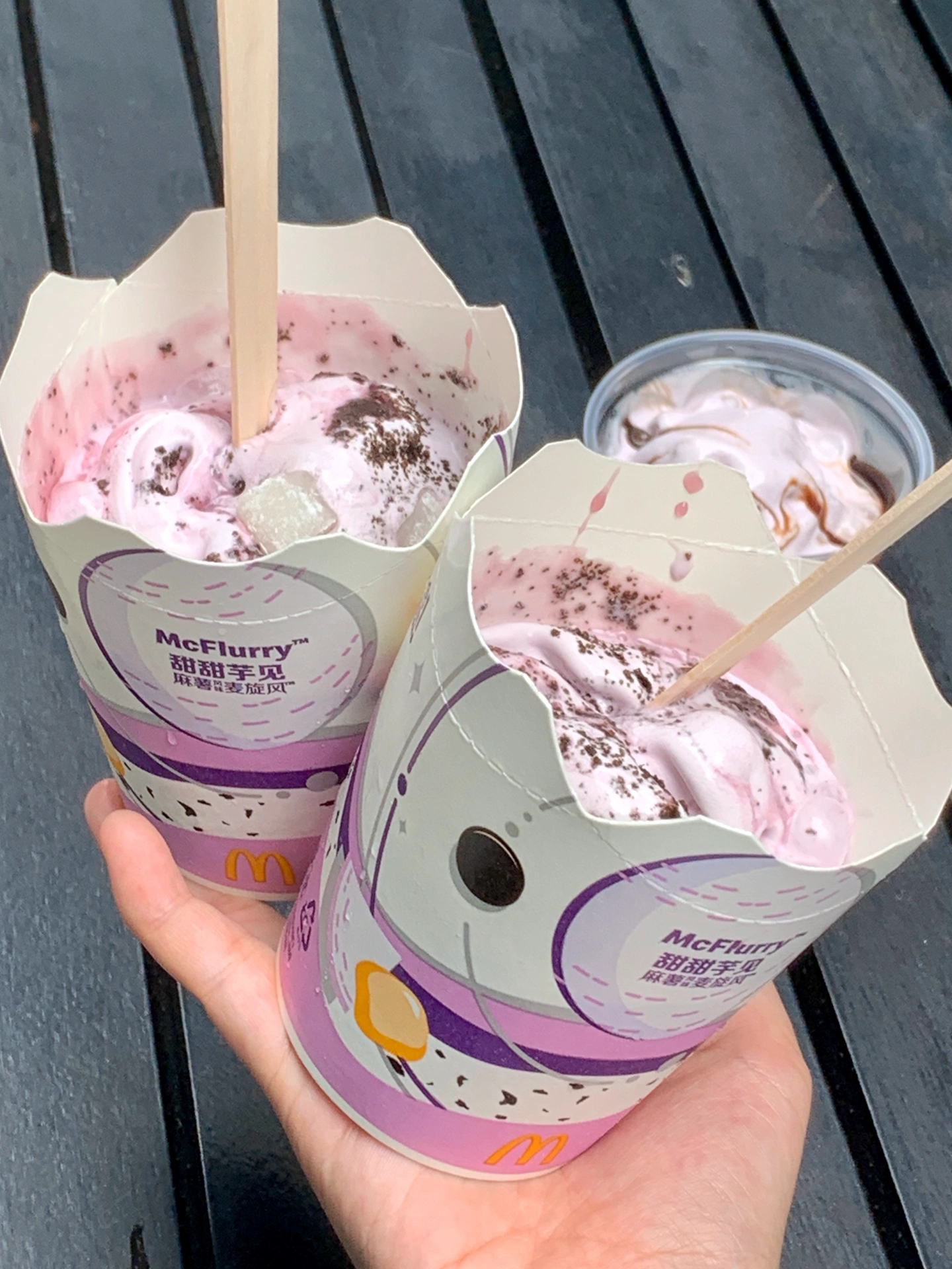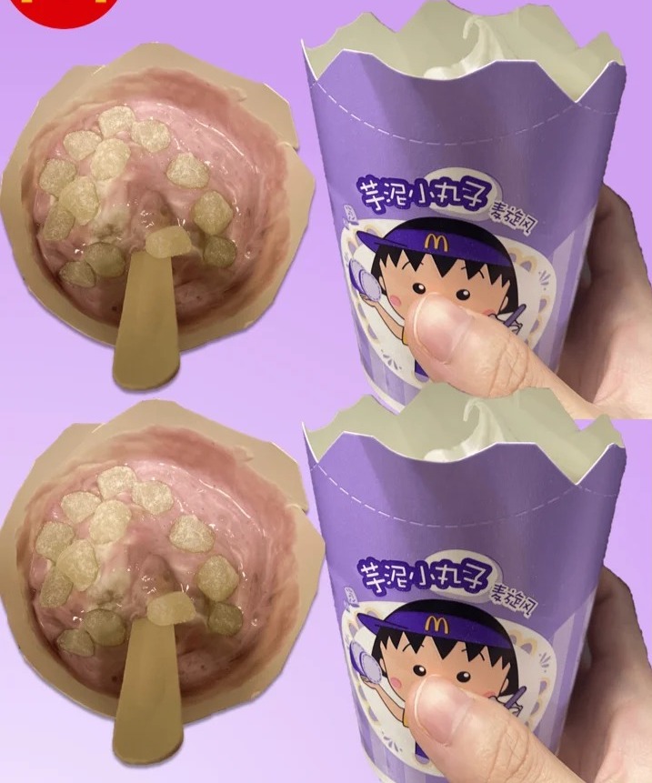 ▼上一次中國麥當勞推出櫻桃小丸子周邊玩具還是2015年,時隔9年小丸子終於再度回歸,這次的新品讓人迫不及待想要擁有。聯名餐點包括「香芋甜筒」和「香芋小丸子冰炫風」。聽到這裡是不是口水已經快流下來了?這款冰炫風是濃郁的芋頭味,還特別加了芋頭丁,口感豐富,吃上一口保證讓你欲罷不能。更棒的是,冰炫風的杯子上印有超級可愛的小丸子圖案,吃完還捨不得丟呢!