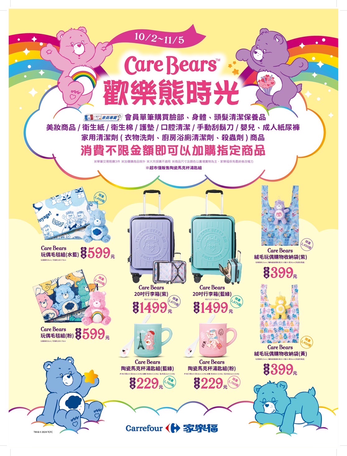 2. 因過半商品已銷售完畢,後續加碼活動:10/16 (三)家樂福APP內「團吧」團購100組「歡樂熊驚喜福箱」,其中包含6樣日用/清潔商品及3樣Care Bears商品(1隻玩偶毛毯組、1隻玩偶購物收納袋、1個帆布袋),款式隨機出貨不得挑選,數量有限售完為止。