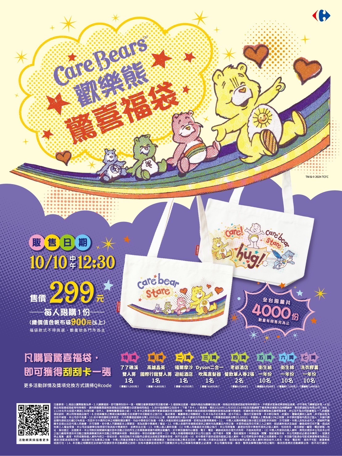 ▼驚喜不斷,10/10(四)中午12:30家樂福量販/超市分店開賣限量4,000份Care Bears歡樂學驚喜福袋,共有15種組合福袋!凡購買驚喜福袋即可獲得刮刮卡一張,有機會刮中:特獎「了了礁溪雙人房」一名、頭獎「高雄晶英國際行館雙人房」一名、二獎「福爾摩沙遊艇酒店」一名、三獎「Dyson 二合一吹風直髮器」一名、四獎「老爺酒店餐飲單人券」兩名。