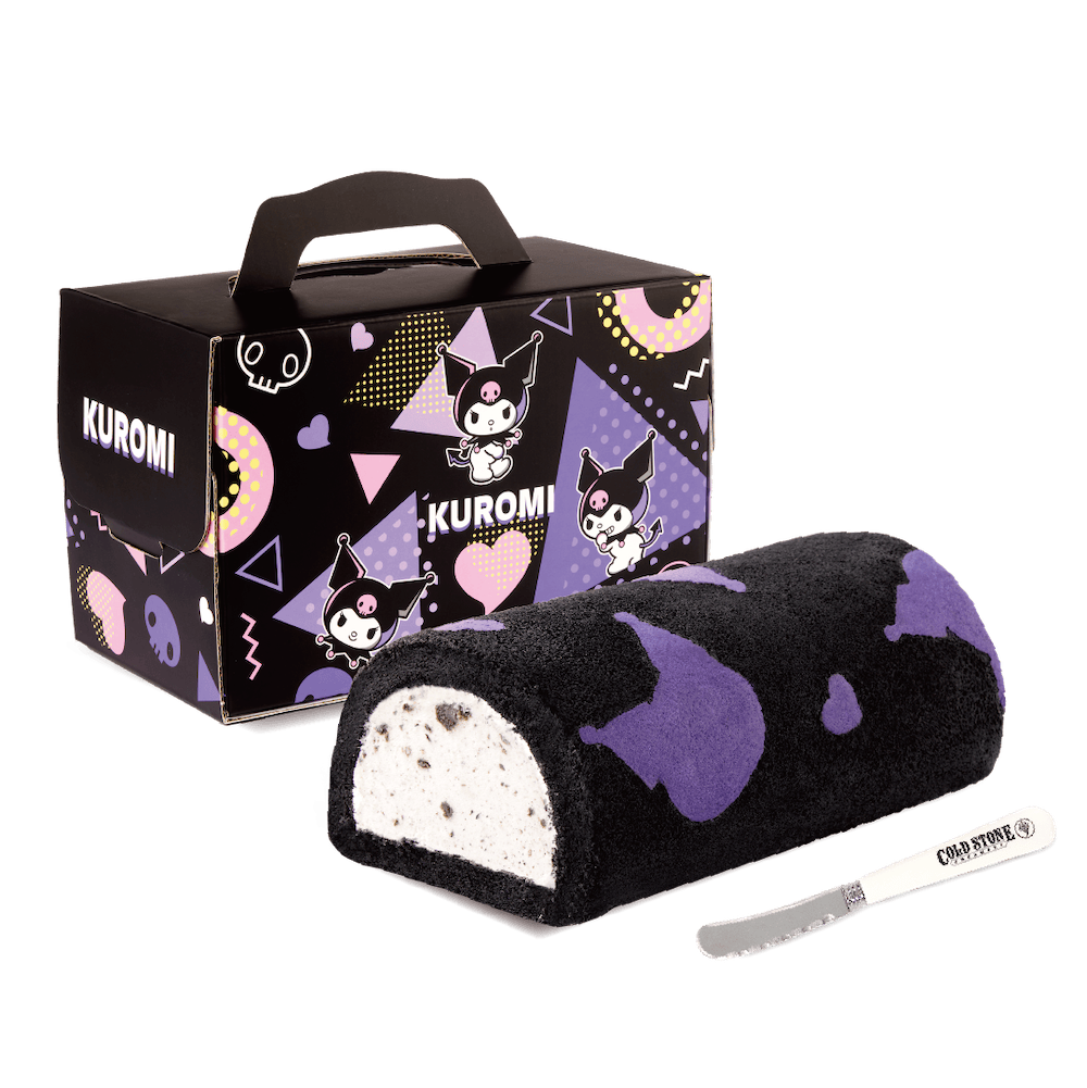 ▼這次的「酷黑Kuromi冰心捲」特別推出限量禮盒,這款以人氣生乳酪冰淇淋搭配Oreo巧克力碎塊的夢幻冰心捲,蛋糕表面壓印Kuromi頭型剪影,呈現酷黑與紫色的夢幻搭配,讓你一次滿足視覺與味覺的雙重享受。不僅有精緻的Kuromi外提盒,還隨盒附贈限量貼紙及酷聖石品牌鋼刀,讓你享用甜點的同時也能收藏Kuromi的可愛周邊。