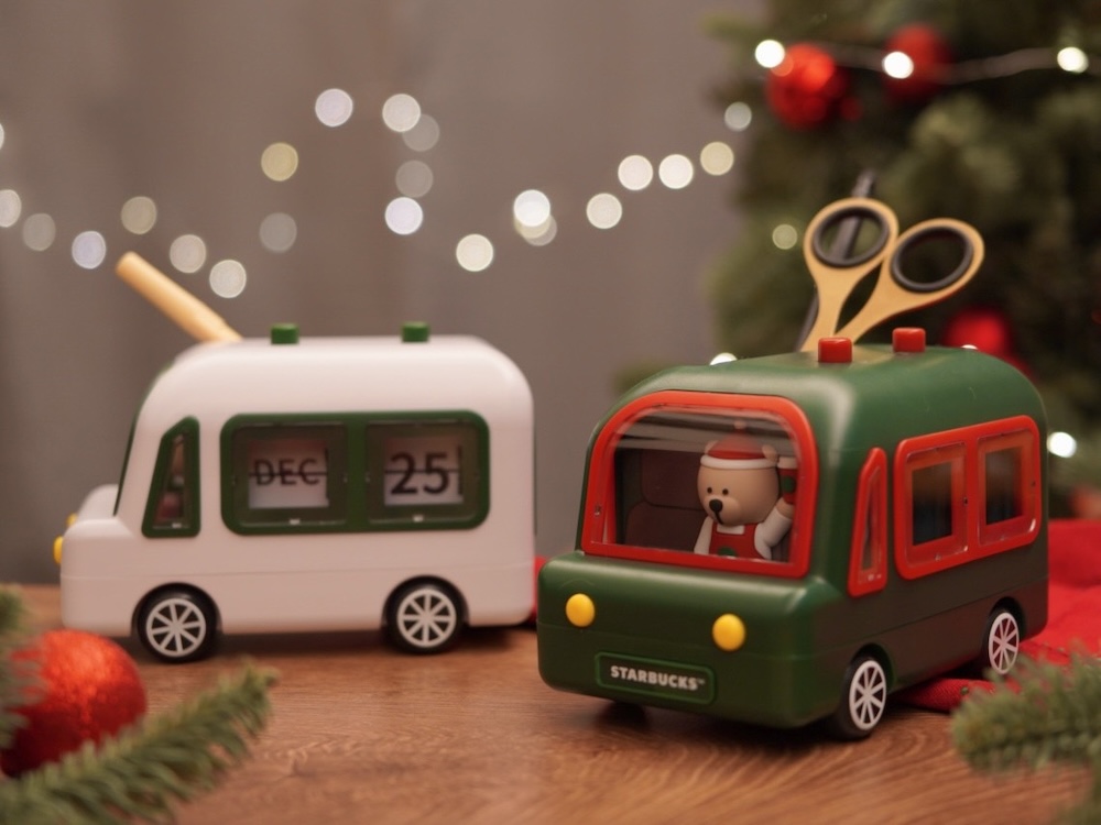 ▼星巴克會不會太超過!這次的按壓桌曆以星巴克經典的咖啡車為靈感,將Bearista小熊坐上車,帶來一股溫馨氛圍。車頂上設計了日期按壓裝置,按下按鈕即可輕鬆更換日期,透過車窗展示,變身最可愛日曆!值得一提的是,桌曆底部還特地設計了小小的置物空間,方便擺放各式小物,實用性滿分。