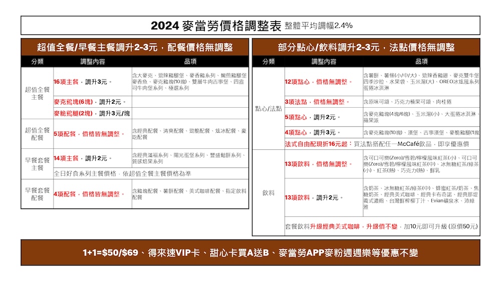 ▼台灣麥當勞自11月20日起,針對部分產品進行價格調整,整體平均調幅約2.4%,麥當勞為因應營運成本調整,部分產品單點價格將調升2-3 元,但套餐配餐價格維持不變。調整範圍包括「超值全餐」主餐單點價格全面調升 2-3 元,如麥脆雞腿每塊調升 3 元(每份含兩塊);「早餐系列」主餐單點調升 2 元,其他價格不變。配餐如麥克雞塊(4 塊)、玉米湯(小)、蛋捲冰淇淋(大)、蘋果派等部分產品價格也調升 2 元;中薯、蛋捲冰淇淋等 13 項商品維持不變。