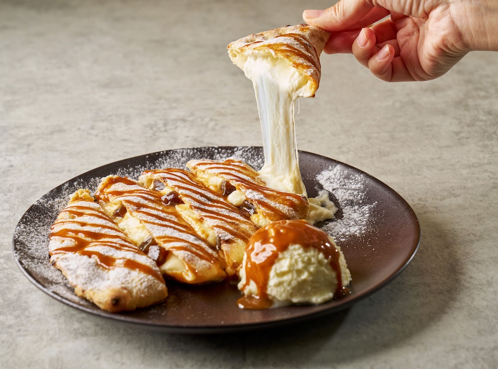 ▼這次聯名新品的四款創意美食,真的能讓你的味蕾大開眼界。首先是「森永牛奶糖蘋果乳酪比薩」,當季的脆甜蘋果與濃醇乳酪搭配,淋上森永牛奶糖醬,甜鹹交織的口感超級豐富,每一口都是完美的融合。
