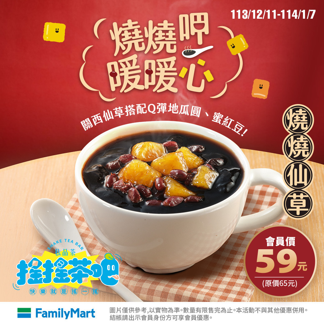 ▼「燒燒仙草」嚴選新竹關西產天然仙草,味道濃郁、甘甜微苦。當然也少不了添加經典配料,Q彈地瓜圓及蜜紅豆,咀嚼口感讓幸福感大升級,都可以在全家搖搖茶吧找到!114/01/07前,更可享會員嚐鮮價59元(原價65元),把握這段冷的時光快喝吧~