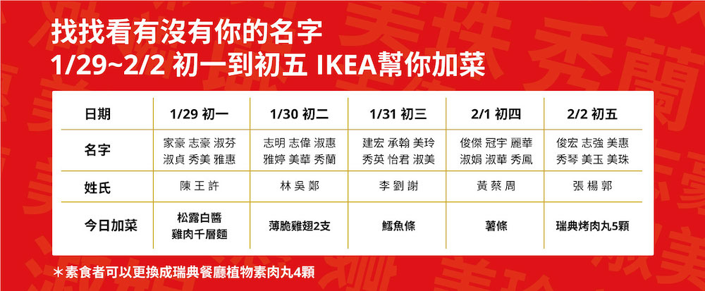 【台北】菜市場名趕緊揪團! IKEA推出春節限定優惠 「淑芬、家豪」免費加菜!