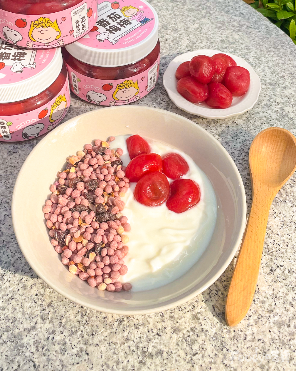 ▼也可以發揮創意~把「番茄梅梅」搭配優格碗享用!配料可以隨意搭配,加上酸甜的番茄喇進去跟優格一起攪拌,增添口感和滋潤,就算原本沒胃口也瞬間想把整碗吃下肚了!