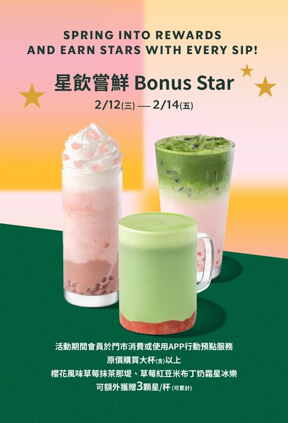1. 2/12至2/14,星禮程會員於門市消費或透過 APP 預訂原價購買大杯(含)以上的櫻花系列飲品,可額外獲得 3 顆星/杯(可累計)。