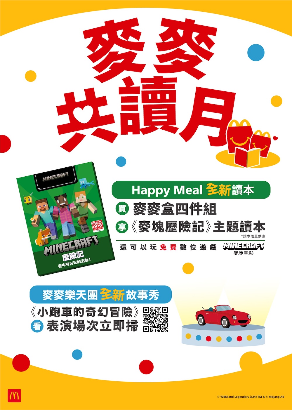 凡購買 Happy Meal麥麥盒四件組,即可獲《麥塊歷險記》主題讀本一本,內含麥塊故事與冒險內容,並可掃描QR Code進入免費的數位互動遊戲。