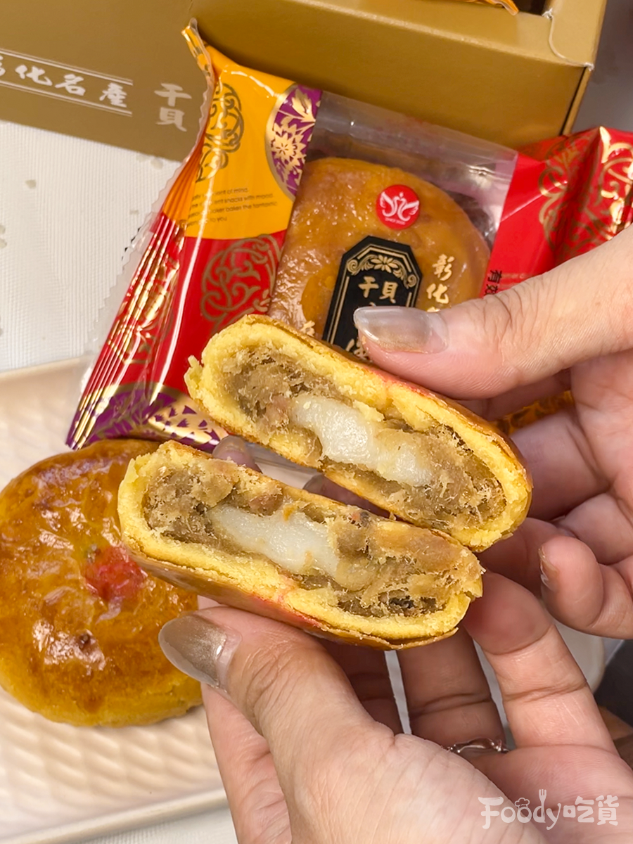 ▼「干貝肉圓酥」使用的原物料也很頂級,「金黃香酥皮」使用頂級安佳奶油製作,入口酥到掉渣但完全不油膩,「特製魯肉餡」完全是古法滷製那種,鹹中帶甜,裡面能吃到精選大顆進口干貝,經慢火烘烤後鎖住海味精華,內餡夾住Q彈麻糬,採用低糖配方,柔軟不黏牙,加一點甜味剛剛好,鹹甜交融恰到好處。