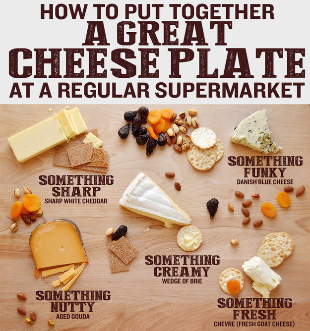 ▼26. 各種各樣的起司:這並不需要開火烹飪,不過它可以搭配不同的食材,組成簡單的餐點。家庭聚會上經常需要準備乾酪盤,根據口感、軟硬度,準備5種就足夠了。較硬的切達起司,搭配麵包、餅乾;鬆軟的藍紋起司,搭配餅乾、麵包、肉、葡萄酒;便酸的山羊起司,搭配麵包、白葡萄酒;切成楔形的布利乾酪,搭配麵包、三明治;豪達起司,搭配餅乾等等。按照下圖將不同的起司切好,然後放一點餅乾、麵包、乾果,乾酪盤就做好了。