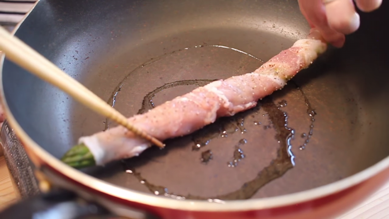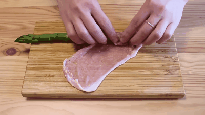 ▼9. 取出蘆筍,用2片豬肉把蘆筍整個包覆起來。
