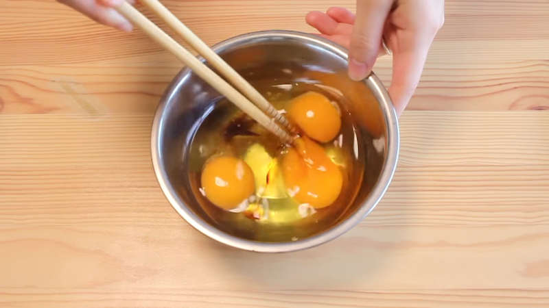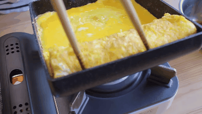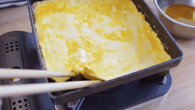 ▼2. 倒到煎玉子燒的容器中,煎到底部稍微凝固,就可以用筷子協助翻面,把蛋捲起來。